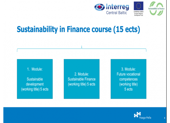 The project SuFi created a 15 ECTS study programme on Sustainable Finance. The project resulted an open online education module within business education to meet new competence needs. The module is rooted in partner institutions and made available for all, on an open educational platform (Moodle).